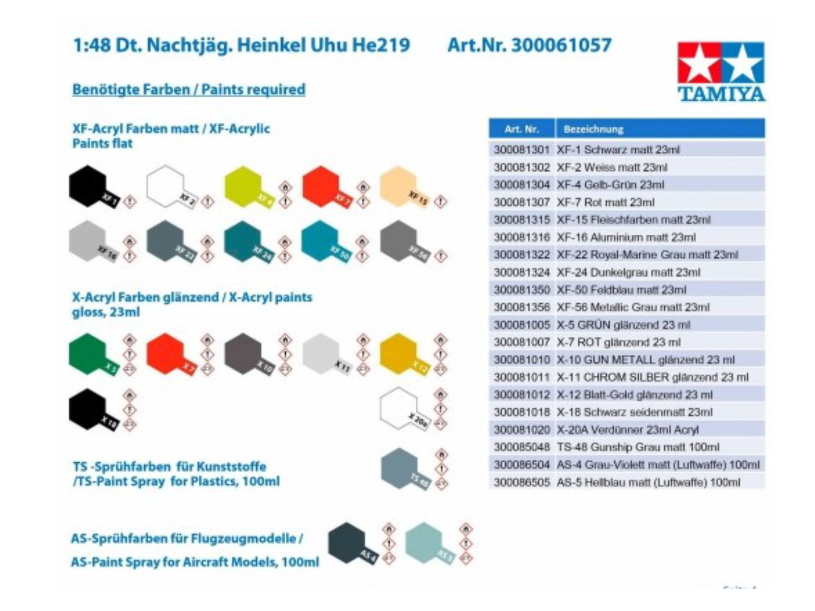 Tamiya colors: AS-4, AS-5, TS-48, X-5, X-7, X-10, X-11, X-12, X-18, XF-1, XF-2, XF-4, XF-7,